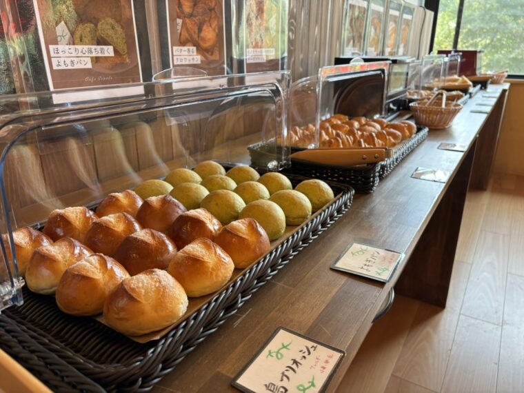 カフェ・スコーラのランチビュッフェでは、のじまスコーラのベーカリーで焼き上げたおいしいパンが並びます🥐