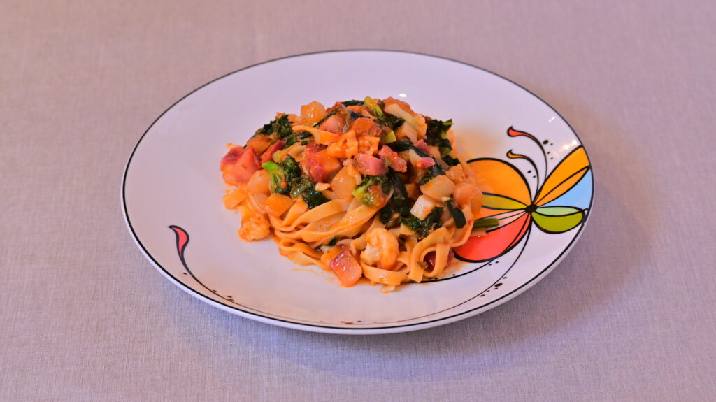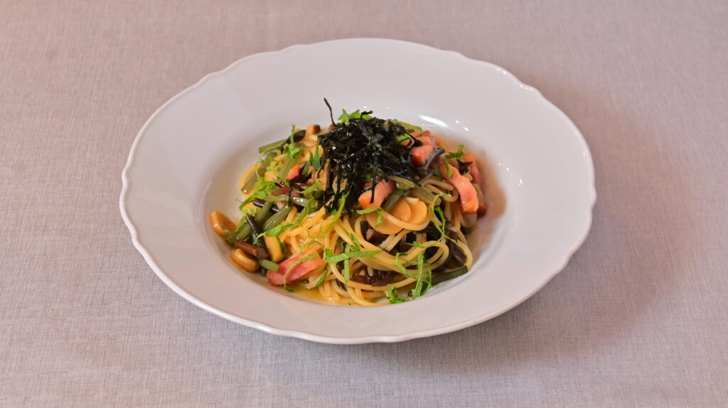 香り高い山菜とベーコンの旨みを合わせた、和風仕立てのパスタ。