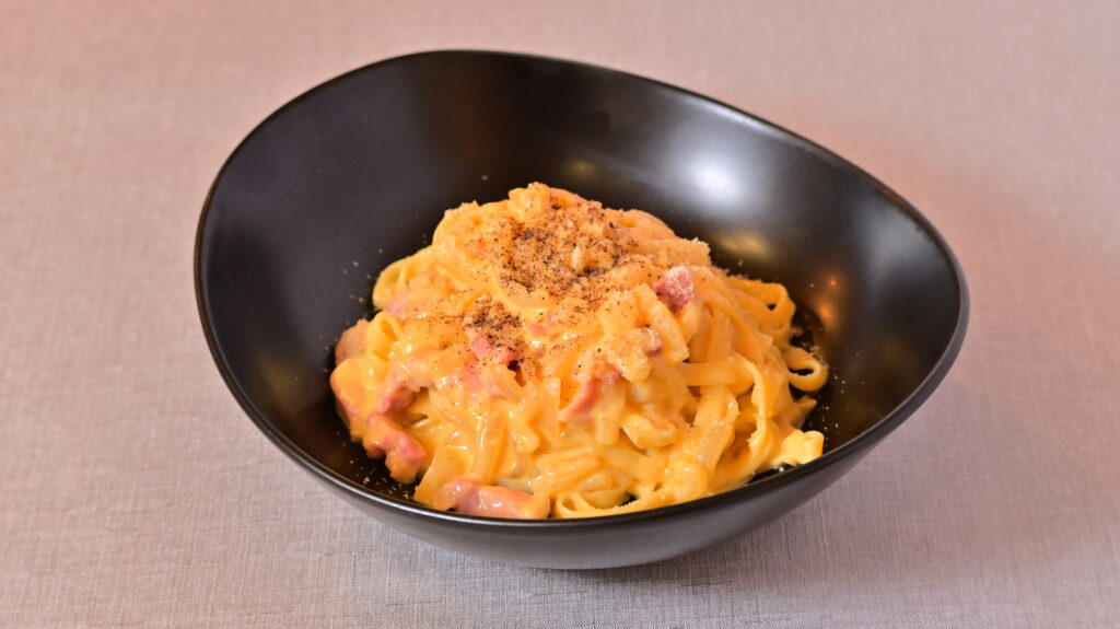 北坂卵の濃厚なコクと、アーモンドミルクのやさしい甘みを合わせたカルボナーラ風パスタ。