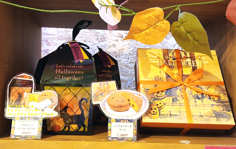 ランタン型のパッケージがおしゃれなランタンギフトと、イラスト入りの紙箱で高級感のあるホールのパンプキンケーキ。