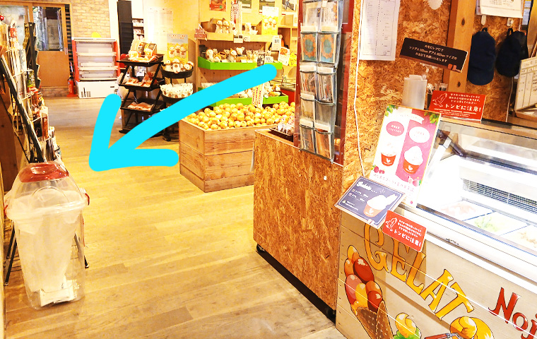 食べ終わった後のカップなどは、ジェラートコーナーの向かいにあるゴミ箱にどうぞ。