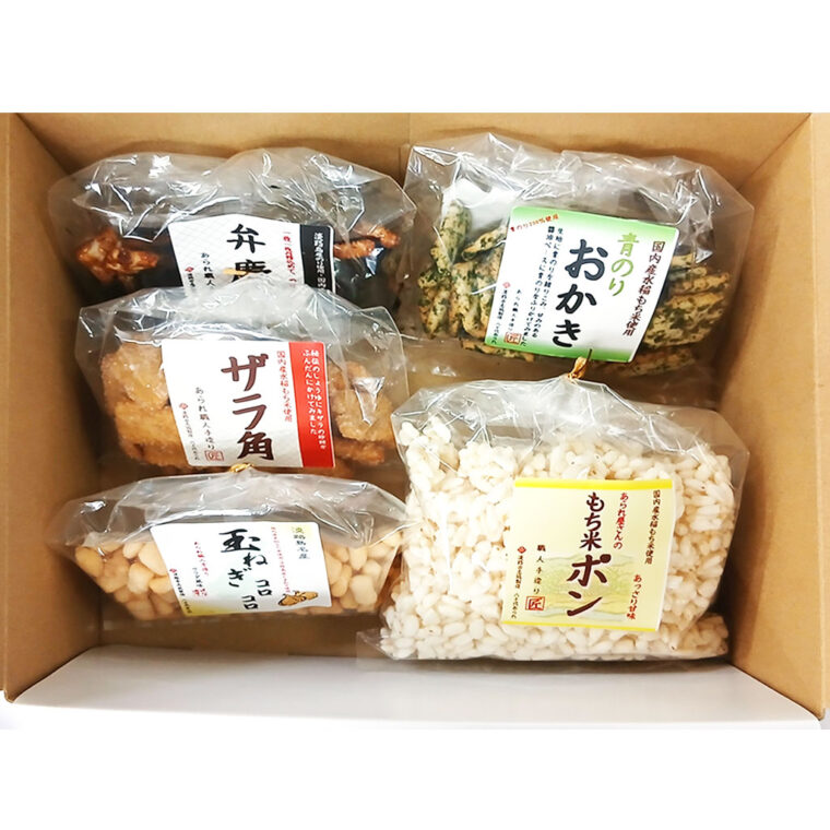 香ばしい「ザラ角」、磯の香り広がる「青のりおかき」、伝統の醤油味が楽しめる「弁慶巻き」、淡路島産玉ねぎの旨みがギュッと詰まった「玉ねぎコロコロ」、サクッと軽い味わいの「もち米ポン」