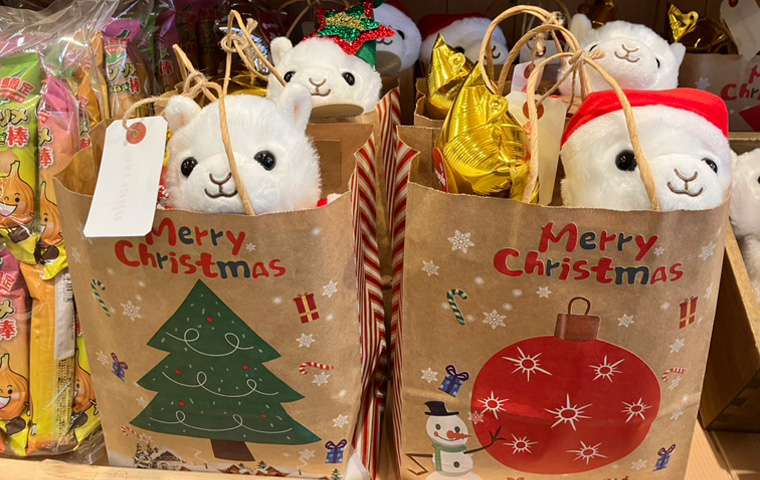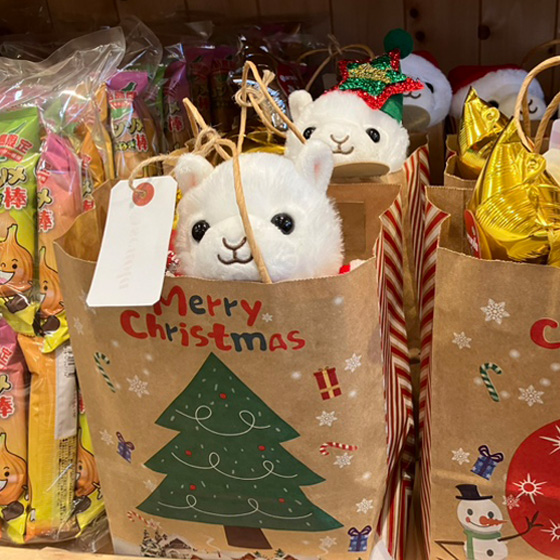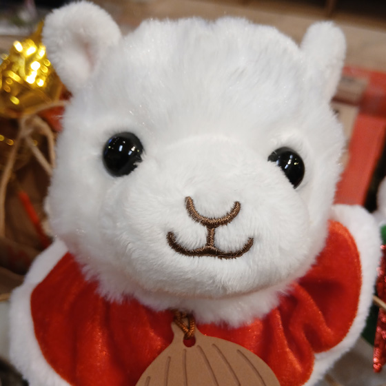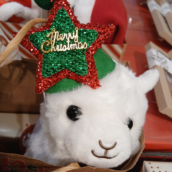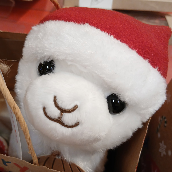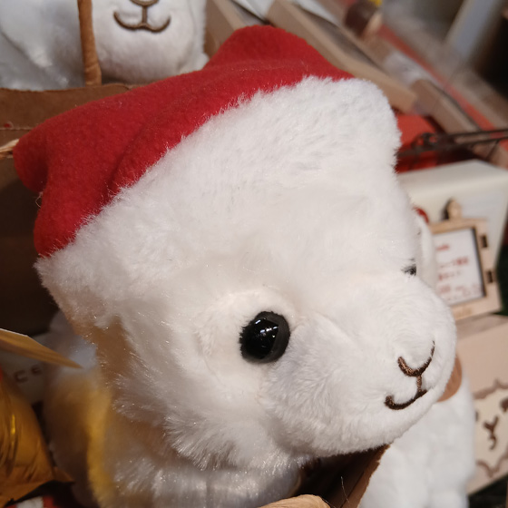 なんと、おなじみのアルパカのラアル君のぬいぐるみがクリスマス小物を身に着けています。