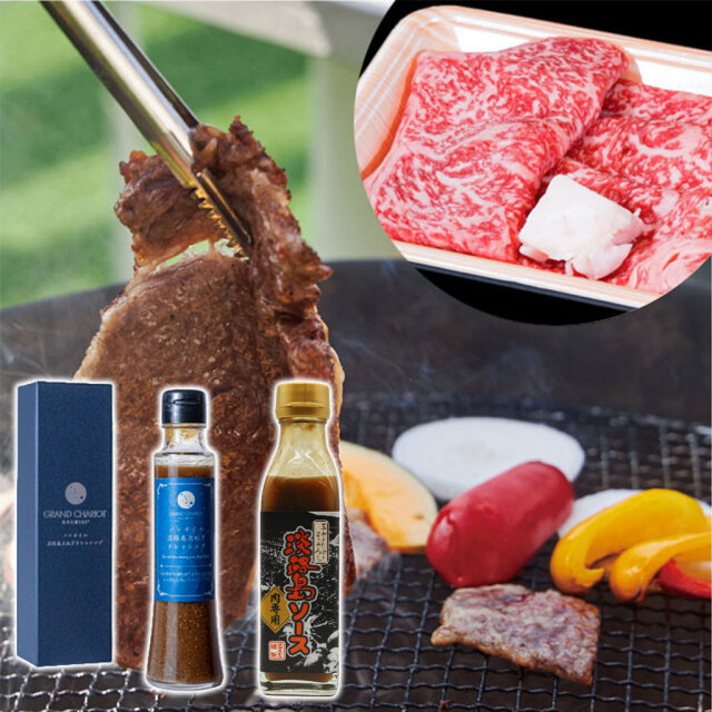 淡路ビーフの BBQ・焼肉食材セット 300g、淡路島ソース 肉専用、ノンオイル淡路島玉ねぎドレッシング 150ml GRAND CHARIOT 北斗七星 135°のセット