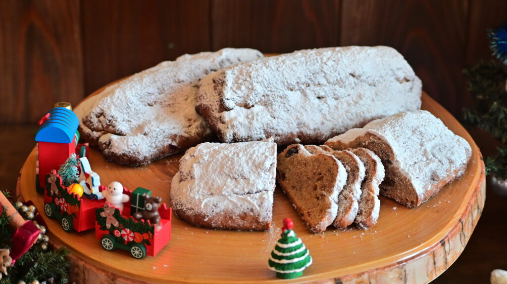 ドイツ発祥のクリスマスの発酵菓子です。ドイツではクリスマスまでの4週間で少しずつスライスして食べていくそうで、日が経つにつれてドライフルーツが生地に馴染んでいくので味の変化をお楽しみいただけます。