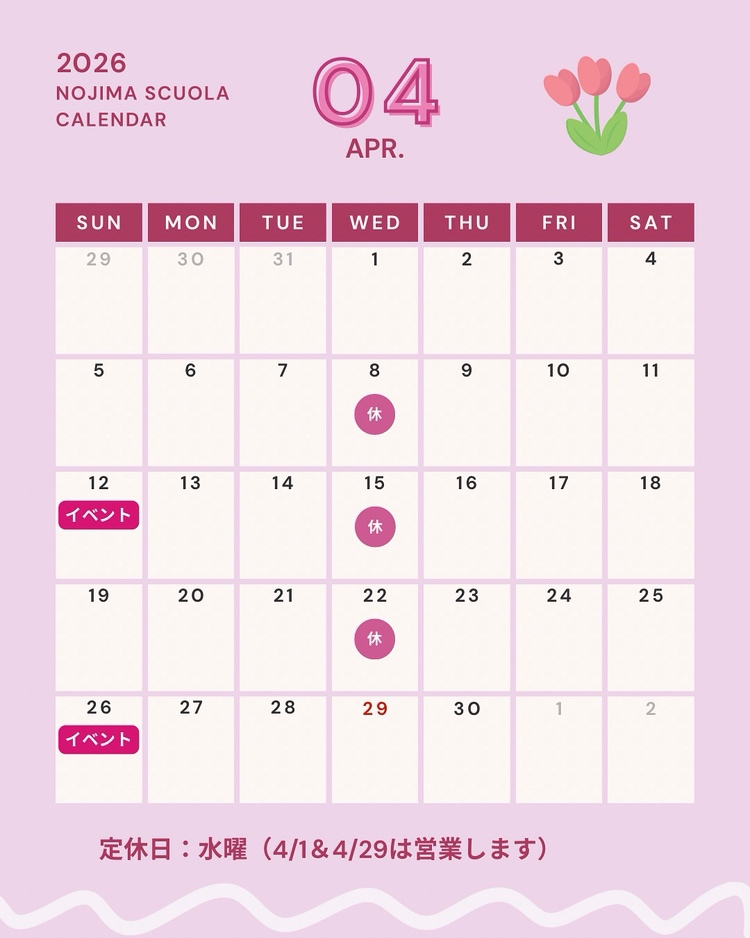 のじまスコーラは※毎週水曜日※が定休日ですが、4/1(水),4/29(水)は営業いたします。