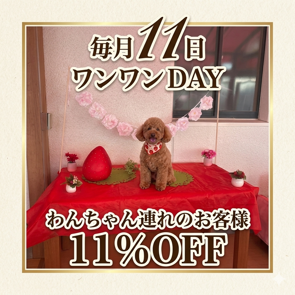 毎月11日(8月除く)は、11のワンワンにちなみ、ドッグテラスご利用のお客様限定でお会計が11%OFFになります。