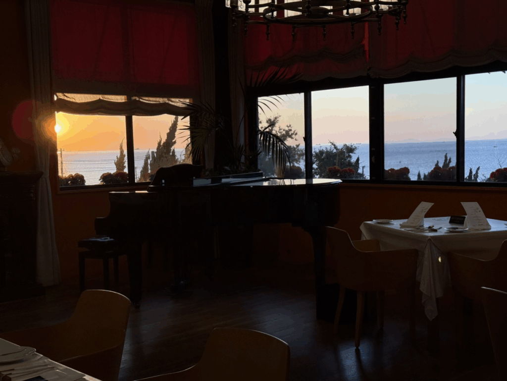 店内は深まる秋の彩りに包まれ、ハロウィンの華やかなカボチャの装飾が温かく迎えます。さらに大きな窓から望むのは、まるで絵画のように美しい秋の夕焼け。黄金色に染まる空が、ゆったりと流れる時間を一層特別なものに演出します。