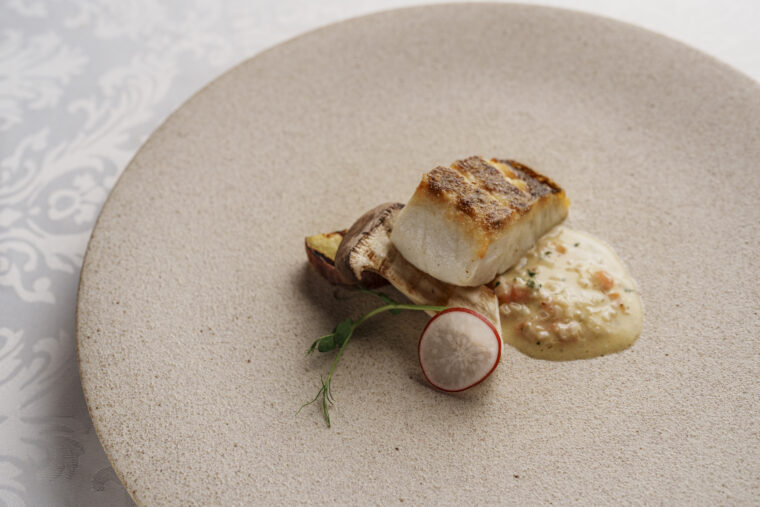 クリーミーで上品な甘みを纏う、カリフラワーの“デュ・バリー”風ソースが、えびす鯛の旨味を一層引き立てます。