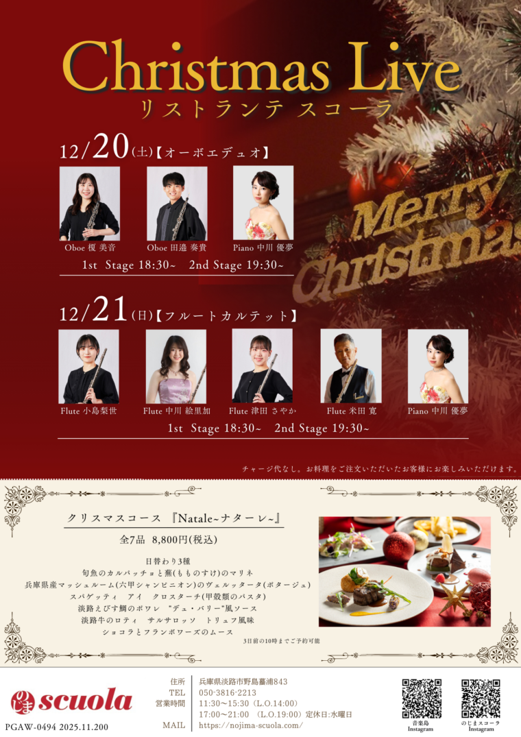 本日は、12月20日・21日限定リストランテ・スコーラで開催するクリスマスミニコンサートの予告でございます。