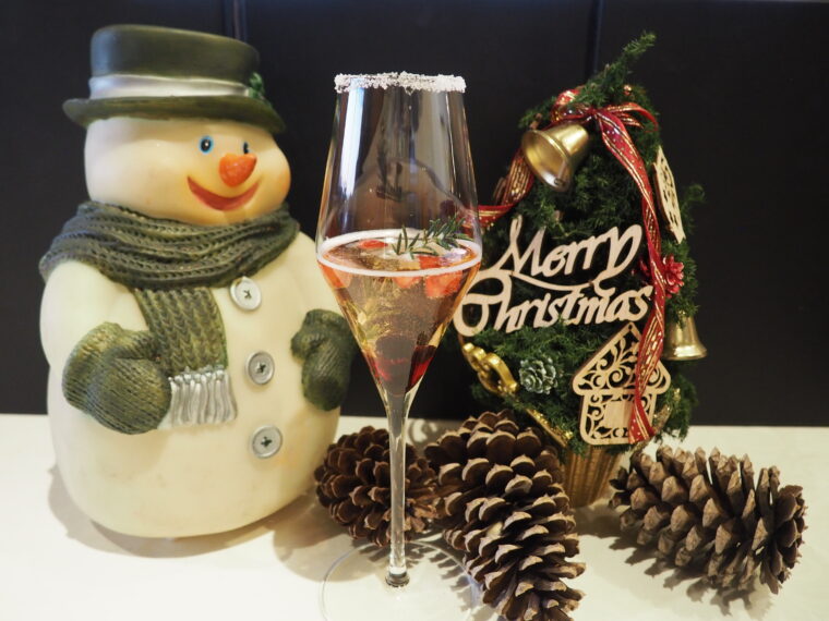 グレナデンシロップの深い赤に、ベリーの華やかな酸味、きらめくスパークリングワインを合わせた、クリスマスカラーをイメージした一杯です。