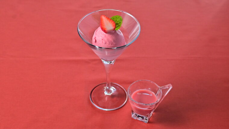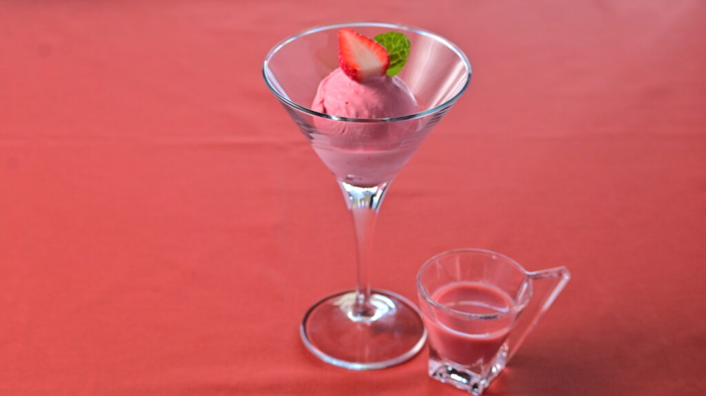 温かい苺ソースを冷たいアイスクリームにかけることで生まれる、ひんやりと温かさが重なり合う絶妙な口どけ。苺の華やかな香りが広がり、最後まで飽きずに楽しめる味わいに仕上げています。
