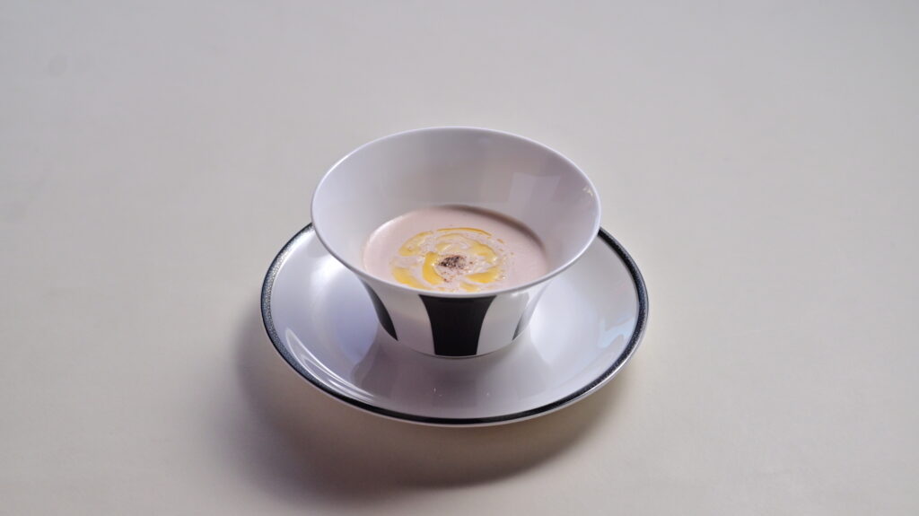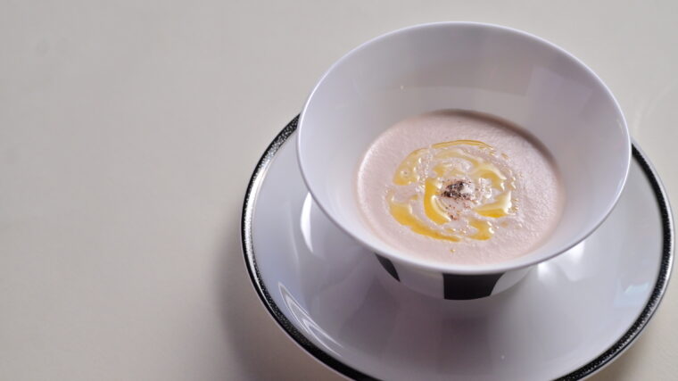 3品目にご用意いたしましたのは、淡路島の大地が育んだ二つの個性が静かに溶け合う「淡路玉葱と苺のポタージュ」でございます。