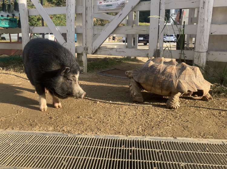 ミニブタのさくらちゃんと園内を歩いてお客さんにご飯をもらったり、写真を撮ってもらったりと