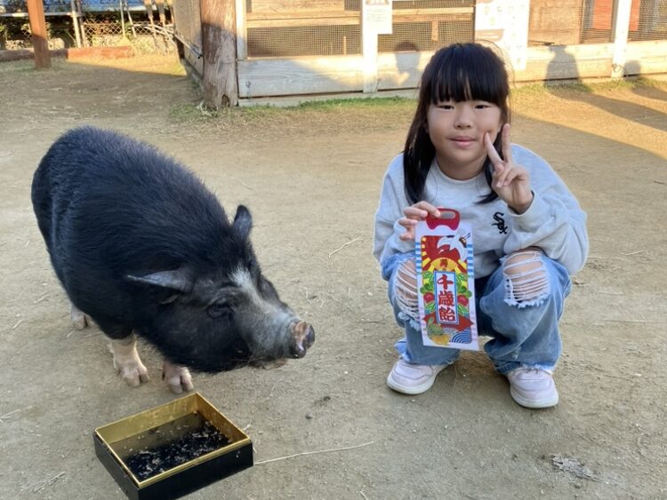 ミニブタのさくらちゃんとももちゃんは七五三のお祝いで千歳団子を