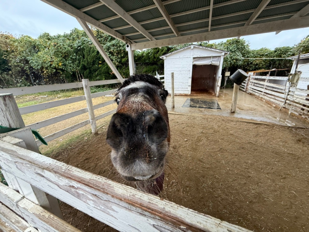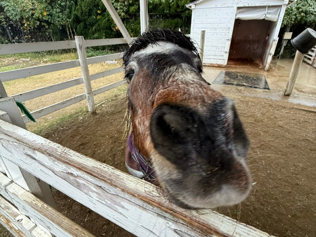 ふと見たら、ポニーのリョーマくんが雨に濡れてめちゃくちゃキリッとしていたので、カメラを向けてみたところ、、、