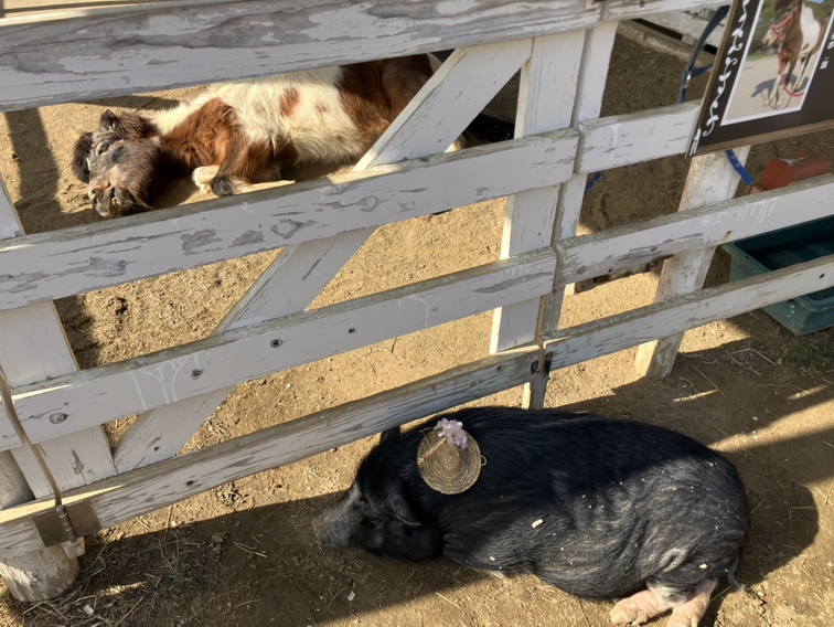 そして、そのすぐそばではミニブタのももちゃんも、お気に入りの麦わら帽子を頭に乗せてスヤスヤ…。