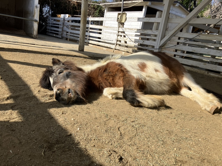 日当たりの良い地面の上で、無防備に足を投げ出してぐっすり眠っているのはポニーのリョウマくん。